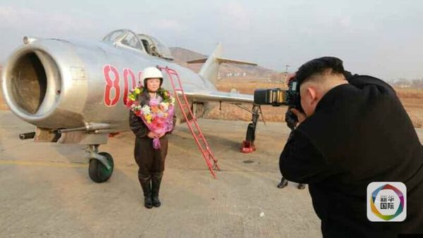 照片显示,女飞行员手捧鲜花,站在一架歼击机前面,金正恩手拿照相机,认真地给她拍照。