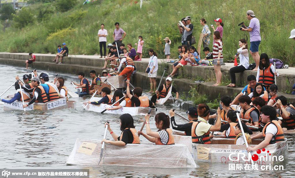 当地时间2015年8月2日,韩国首尔市民在汉江公园里参加划纸船大赛。图片来源:CFP