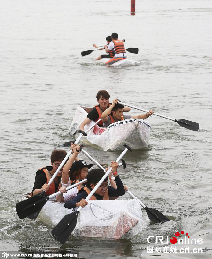 当地时间2015年8月2日,韩国首尔市民在汉江公园里参加划纸船大赛。图片来源:CFP