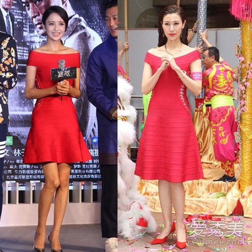 佟丽娅VS李嘉欣:Herve Leger 红色一字肩绑带裙