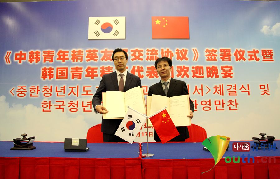 团中央书记处常务书记、全国青联主席贺军科与韩国国际交流财团理事长柳现锡正式签署了《中韩青年精英友好交流协议》。中国青年网记者 李延兵 摄