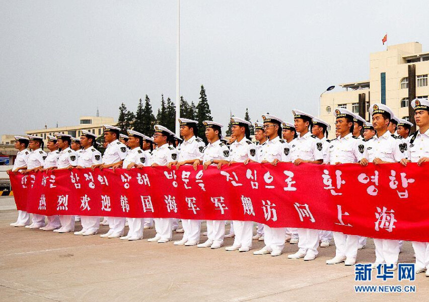 中国海军官兵在上海吴淞军港列队欢迎到访的韩国海军舰艇编队。