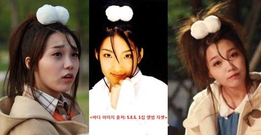 韩剧《请回答1997》中女主角是一名S.E.S的狂饭,演员郑恩地再现了团员BADA的经典打扮。