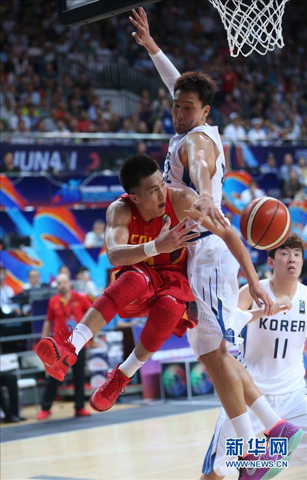 9月24日,中国队球员郭艾伦(左)突破分球。当日,在湖南长沙举行的2015亚洲男篮锦标赛小组赛C组比赛中,中国队以76比73战胜韩国队,取得两连胜。 新华社记者孟永民摄