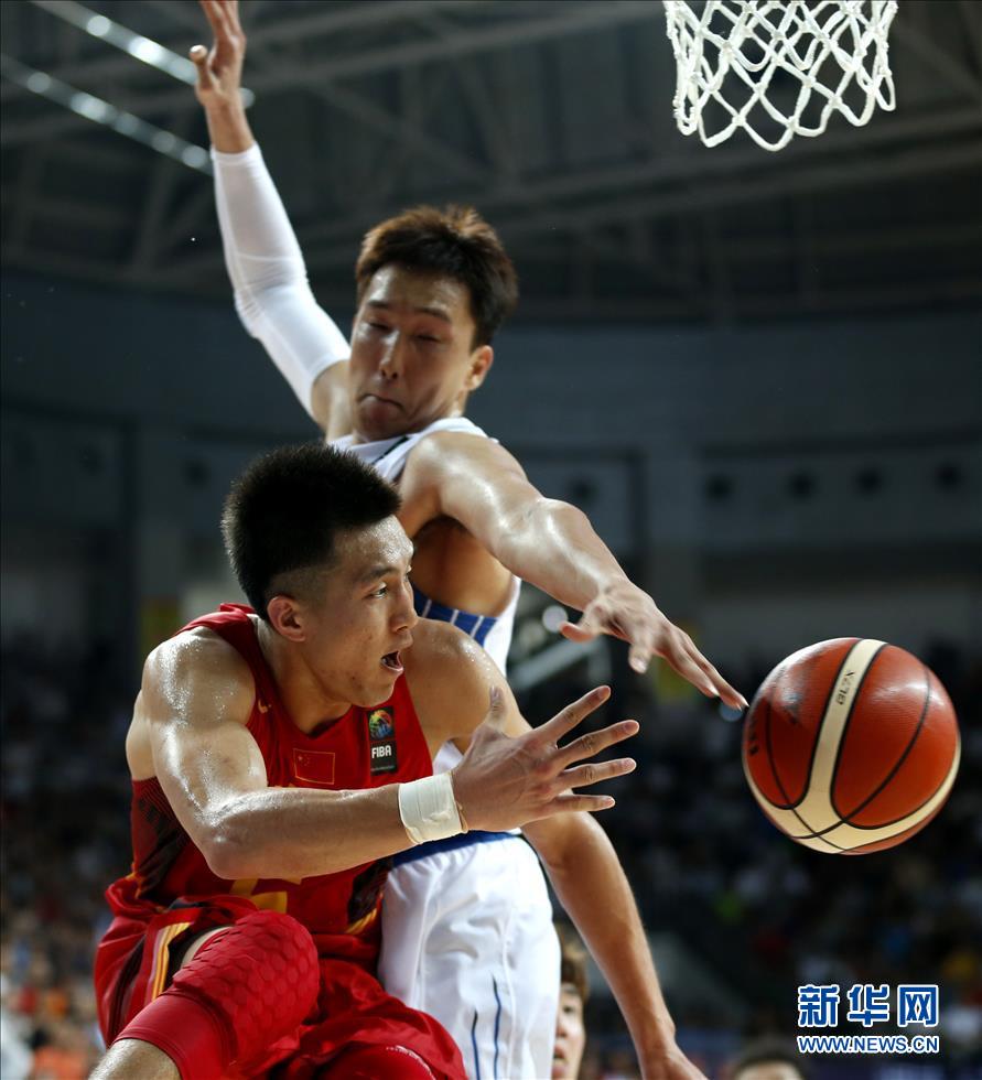 9月24日,中国队球员郭艾伦(下)在比赛中分球。当日,在湖南长沙举行的2015亚洲男篮锦标赛小组赛C组比赛中,中国队以76比73战胜韩国队,取得两连胜。 新华社记者张晨摄