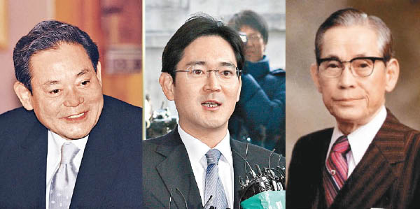 李秉喆(右)创建三星集团,儿子(左)及孙儿(中)均参与业务。