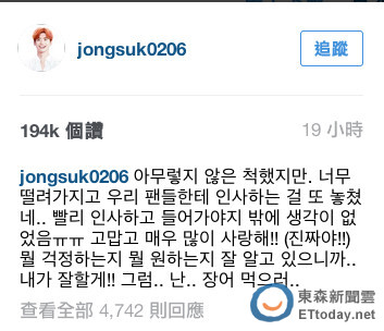 “虽然假装镇定,但其实我很紧张。”李钟硕解释为何仅说1句话便下台,称他当时心里只想着快点打招呼、快点下台,“但因为太紧张,我又错过给粉丝的问候了!呜呜,我真的非常爱你们!(是真的!)”文末他表示知道粉丝想要什么、担心什么,还说:“我会更努力噢!那,我要去吃鳗鱼饭喽。”