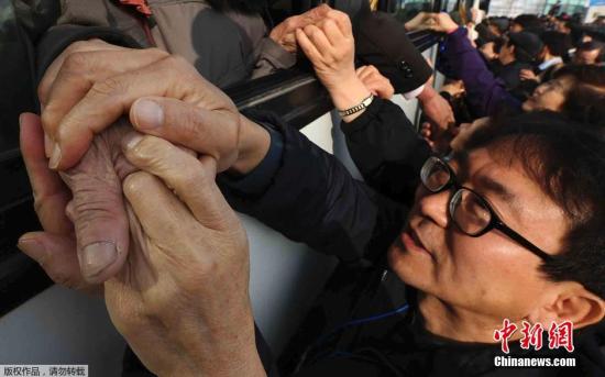 图为当地时间2014年2月25日,韩朝离散家属第二轮会面活动结束,亲属间挥泪话别。