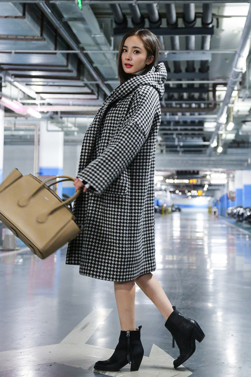 时尚辣妈杨幂不仅演技精湛,对时尚的敏锐度同样不可小觑,一身黑白细格纹中长款连帽大衣,搭配粗跟黑色短靴,手挽Bally2015秋冬新款Sommet包袋。精致红唇妆容与整体造型完美结合,成熟女人味中又隐约透露出丝丝俏皮的时髦。