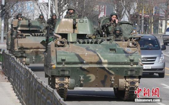 当地时间2015年3月2日,韩美联合军司令部和联合参谋本部启动2015年度韩美“关键决断”(KR)和“鹞鹰”(FE)联合演习,韩国陆军K-200装甲车在京畿道杨州市马路上排成一列徐徐前进。图片来源:CFP视觉中国