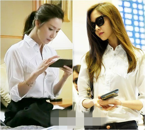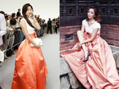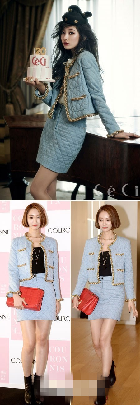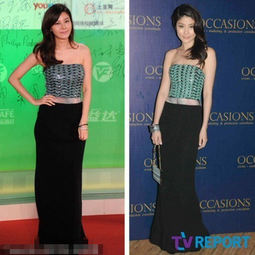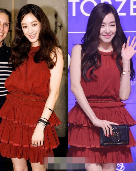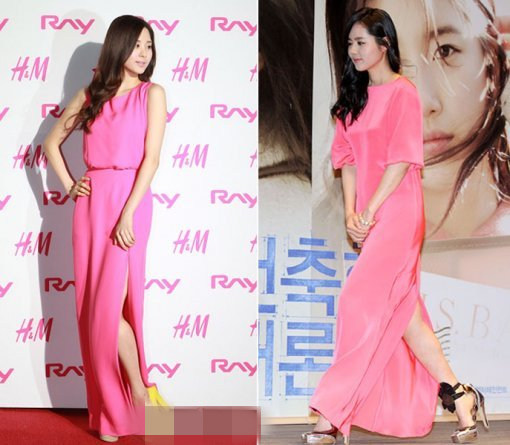 粉碎及踝长裙是女星的最爱,徐贤和韩佳人也由于对粉色的钟爱而尴尬撞衫。但是,徐贤演绎出的是可爱俏皮的粉色诱惑,韩佳人则将这件粉色长裙的轻熟、优雅的气质完美呈现。