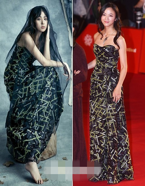 同样拥有高挑身材的姜素拉和汤唯,对这件蓝色纱质长裙情有独钟。不管是拍摄写真还是走红毯,这么一条长裙都被两位女神演绎地性感有气质,吸睛力度百分百。