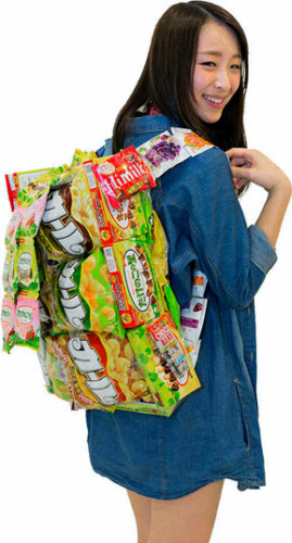近来,“零食背包”在日韩年轻女性及小孩子中颇受欢迎。这种将各色零食包装拼接在一起,组成一个背包的DIY创意,最先从韩国发起,之后更是作为生日礼物及聚会道具形成一股流行风潮。除背包以外,日韩各大零食制造商还提出制作帽子及靴子的创意等,很有趣。