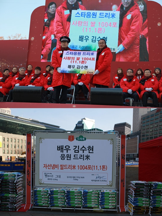韩星金秀贤在首尔广场举行的救世军“慈善锅”捐款活动启动仪式上捐献了11.1吨大米,用于帮助贫困家庭过冬。
