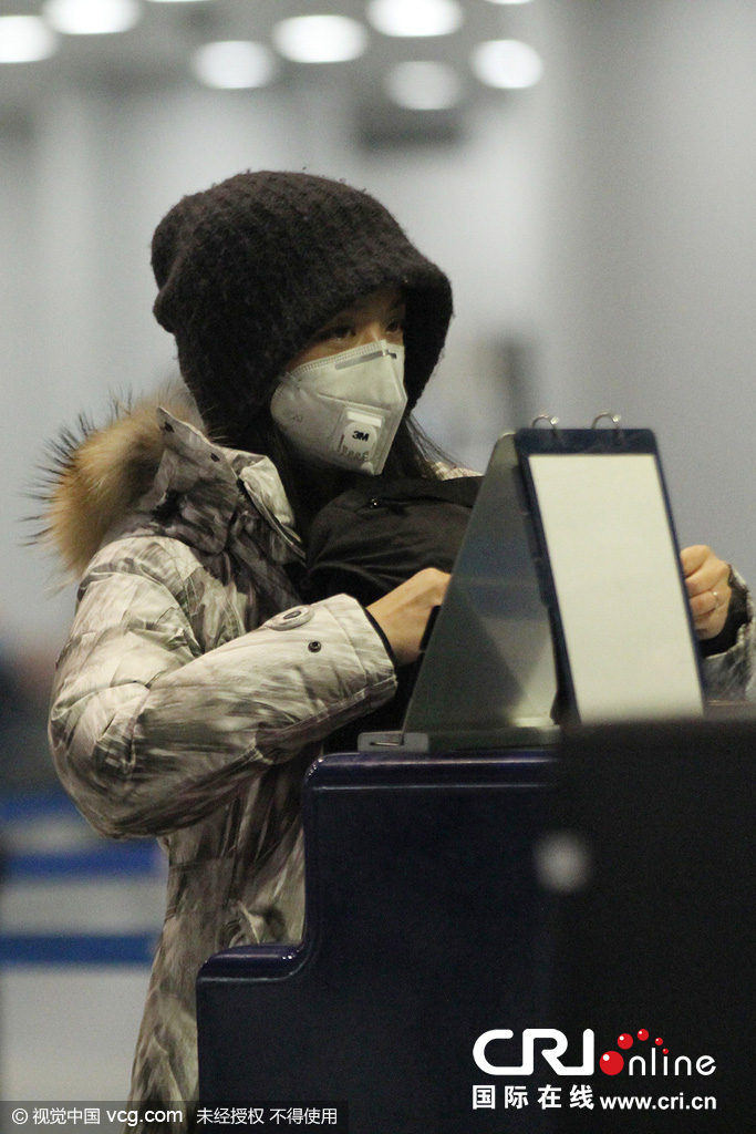汤唯戴防毒面罩赴韩疑探老公 棉服绒帽全副武装