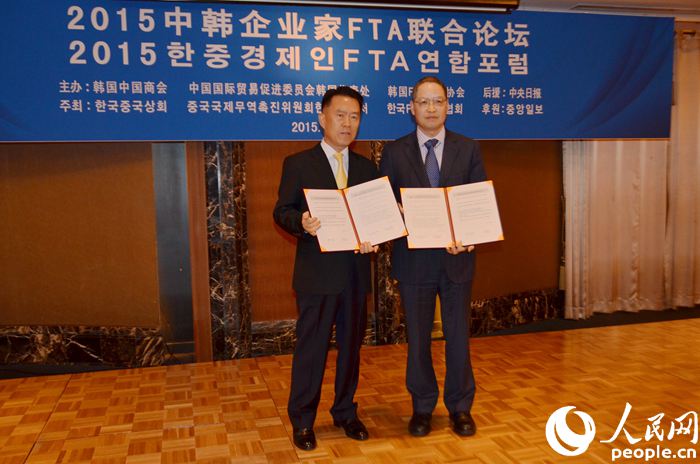韩国中国商会与韩国FTA产业协会发表合作宣言。夏雪 摄