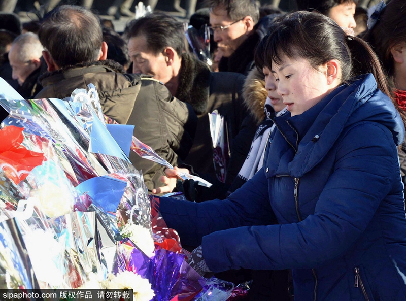 当地时间2015年12月17日,朝鲜平壤,金正日逝世四周年,朝鲜民众前往向金正日雕像鞠躬献花。(图片来源:希帕中国)