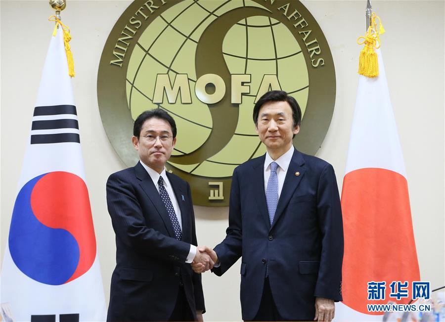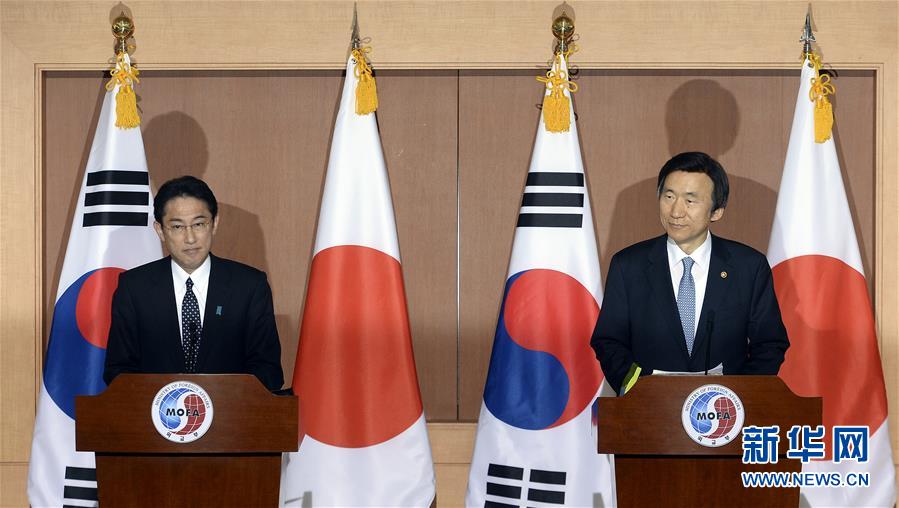 12月28日,韩国外交部长官尹炳世(右)与日本外相岸田文雄在韩国首尔会晤。韩国外交部长官尹炳世28日与到访的日本外相岸田文雄在首尔就日军“慰安妇”问题举行会谈并达成一致意见。尹炳世表示,如果日方能切实履行其作出的承诺,韩方将确认“慰安妇”问题终结。新华社/纽西斯通讯社