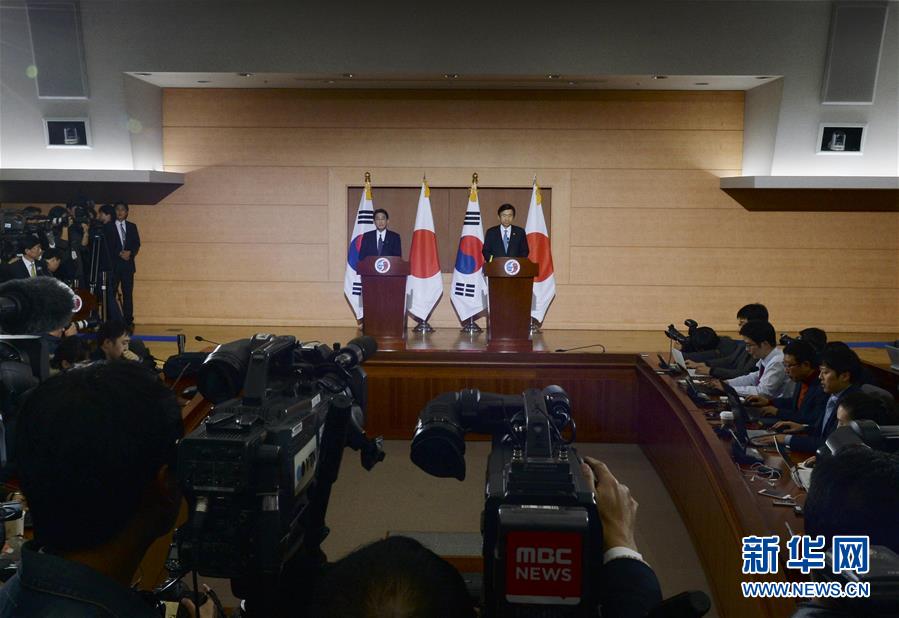 12月28日,韩国外交部长官尹炳世(中右)与日本外相岸田文雄(中左)在韩国首尔举行记者会。韩国外交部长官尹炳世28日与到访的日本外相岸田文雄在首尔就日军“慰安妇”问题举行会谈并达成一致意见。尹炳世表示,如果日方能切实履行其作出的承诺,韩方将确认“慰安妇”问题终结。新华社/纽西斯通讯社