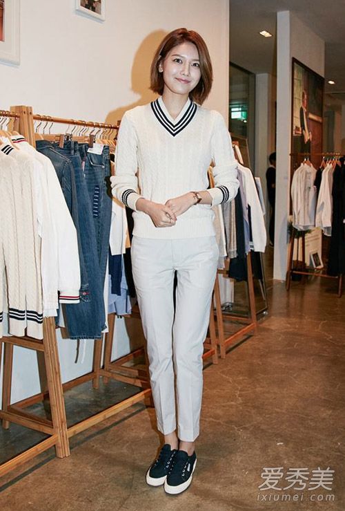 这种基础款的白毛衣秀英也穿得格外好看,配白色九分裤、黑色球鞋,清新大方,剪了短发后确实更加俏皮时髦了。