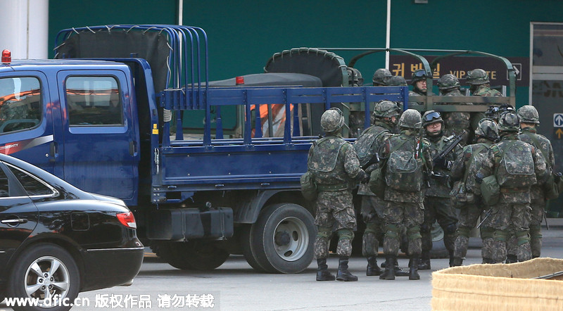 当地时间2016年1月15日,韩国首尔,首尔金浦机场国内线航站楼,韩军搜索队和警察特工队正在展开搜索。当天金浦机场呼叫中心接到了炸弹恐吓电话。