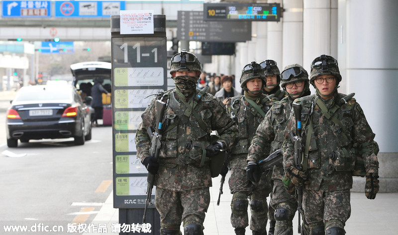 当地时间2016年1月15日,韩国首尔,首尔金浦机场国内线航站楼,韩军搜索队和警察特工队正在展开搜索。当天金浦机场呼叫中心接到了炸弹恐吓电话。