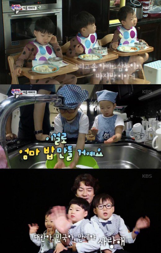 韩国KBS电视台节目《超人回来了》出演者宋一国一家确定退出节目,最后一期中三胞胎亲自去买爱心盒饭送妈妈。