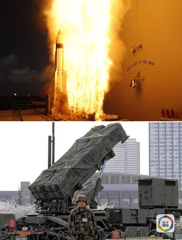 接片:上图,美军军舰发射“标准-3”拦截导弹;下图,日本部署的“爱国者-3”拦截导弹。