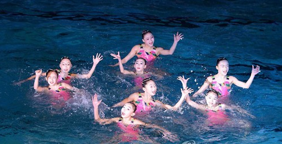 朝鲜美女跳水上芭蕾舞庆祝金正日诞辰日(网页截图)