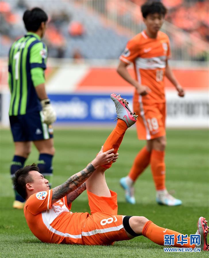 3月16日,鲁能队球员王永珀在比赛中受伤倒地。当日,在2016赛季亚冠联赛小组赛第三轮比赛中,中国山东鲁能队主场以1比4不敌韩国FC首尔队。 新华社记者徐速绘摄