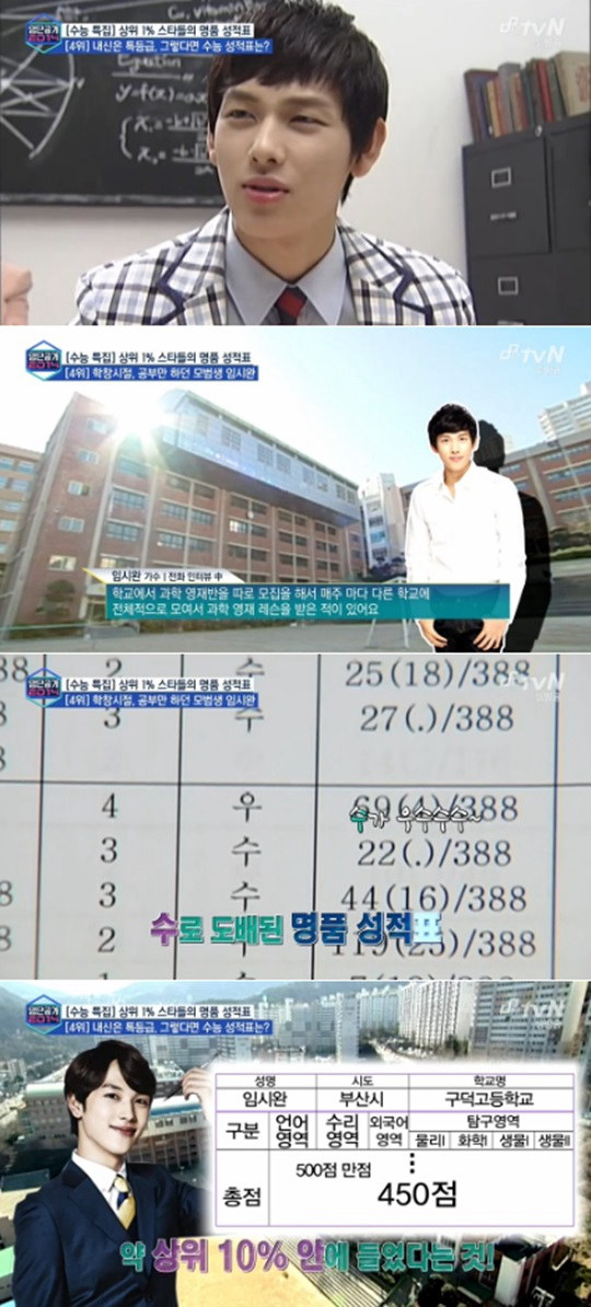 韩国tvN节目《名单公开2014》曾经公开了林时完的成绩单。成绩单上显示,林时完成绩全优,还有全勤奖、优秀奖。而林时完所考进的釜山大学机械工学专业也是当年高考成绩450分以上(满分500分)才能被录取的专业。
