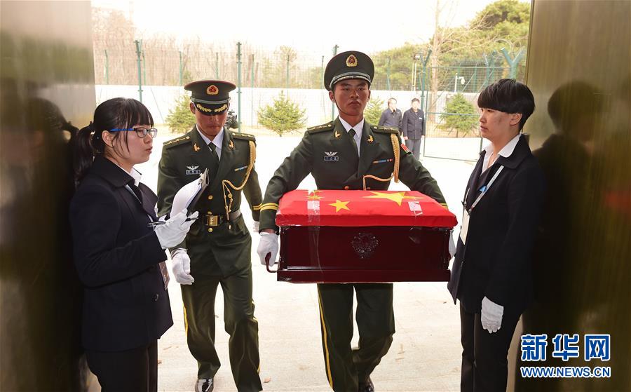 3月31日,礼兵护送遗骸到达沈阳抗美援朝烈士陵园。当日,第三批在韩36位中国人民志愿军烈士遗骸回到祖国。中韩双方在2014年和2015年已成功交接共505具在韩中国人民志愿军烈士遗骸。新华社记者 杨青 摄