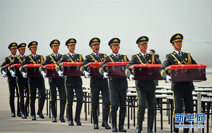 3月31日,在沈阳桃仙机场,礼兵手捧志愿军烈士遗骸棺椁。当日,第三批在韩36位中国人民志愿军烈士遗骸回到祖国。中韩双方在2014年和2015年已成功交接共505具在韩中国人民志愿军烈士遗骸。新华社记者 杨青 摄