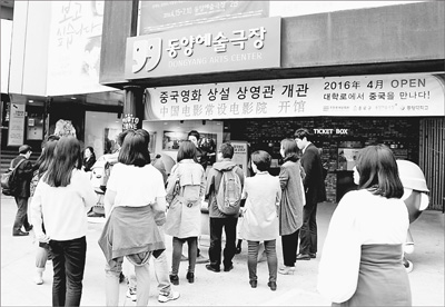 在中国电影常设电影院门前,韩国观众们正在排队等待领票。陈尚文摄