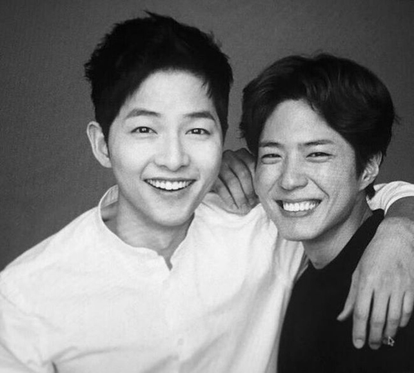 在公开的照片中,宋仲基与朴宝剑亲昵的相互搭着肩膀,两个人分别身穿干净的黑白衬衫,冲着镜头露出了迷人的微笑。