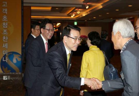 5日上午,新韩银行行长赵镛炳同与会贵宾握手。(图片来源:新韩银行)