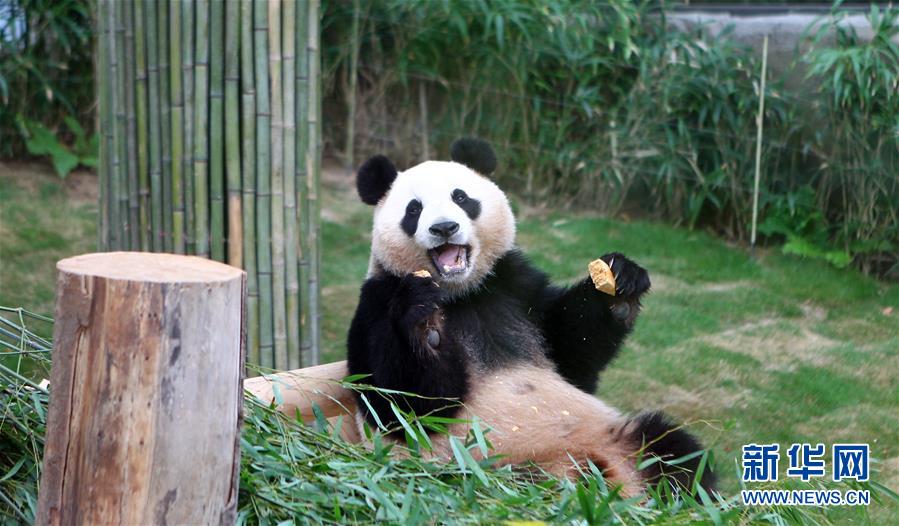 4月21日,在韩国京畿道龙仁市,大熊猫“爱宝”在爱宝乐园享用竹子。当日,旅韩大熊猫“爱宝”和“乐宝”正式与韩国公众见面。这对“大熊猫夫妇”今年3月来到韩国,在位于韩国京畿道龙仁市爱宝乐园内的“熊猫世界”安家,将在韩国度过15年的旅居生活。新华社记者 姚琪琳 摄