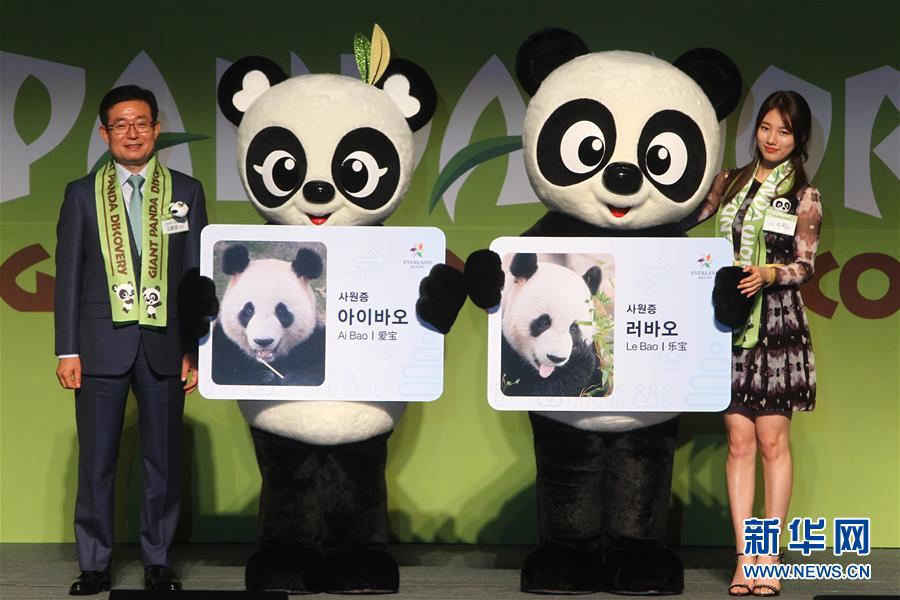 4月21日,在韩国京畿道龙仁市的爱宝乐园,爱宝乐园所属的三星物产度假村社长金奉英(左)与韩国艺人秀智为中国大熊猫“爱宝”和“乐宝”颁发名誉社员证。当日,旅韩大熊猫“爱宝”和“乐宝”正式与韩国公众见面。这对“大熊猫夫妇”今年3月来到韩国,在位于韩国京畿道龙仁市爱宝乐园内的“熊猫世界”安家,将在韩国度过15年的旅居生活。新华社记者 姚琪琳 摄