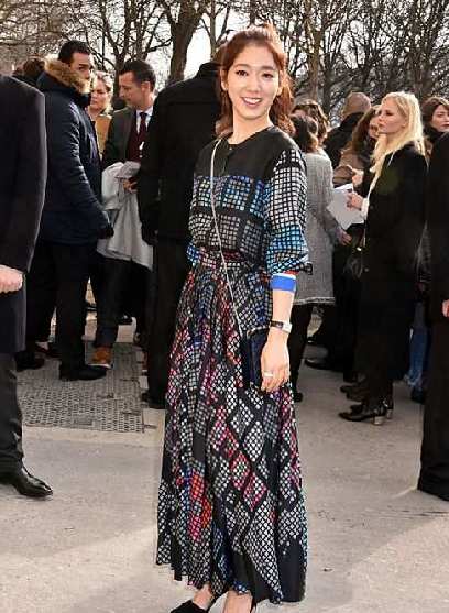 2016春夏时装周期间,身穿格子拼色连衣裙配尖头高跟鞋,展现优雅轻熟的一面,大气迷人。