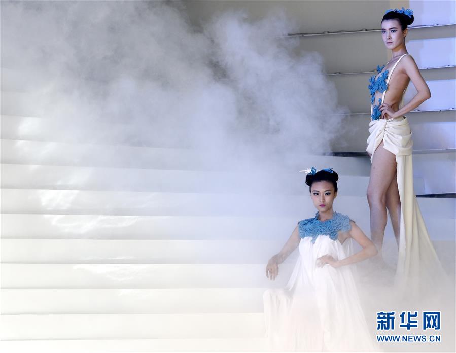 5月11日,模特在展示时装设计师刘薇设计的时装。当日,第十六届中国(青岛)国际时装周正式开幕,来自中国、韩国、日本、澳大利亚等多个国家和地区的时装设计师,将在为期5天的时装周期间进行30多个场次的时装发布。新华社记者 陈建力 摄