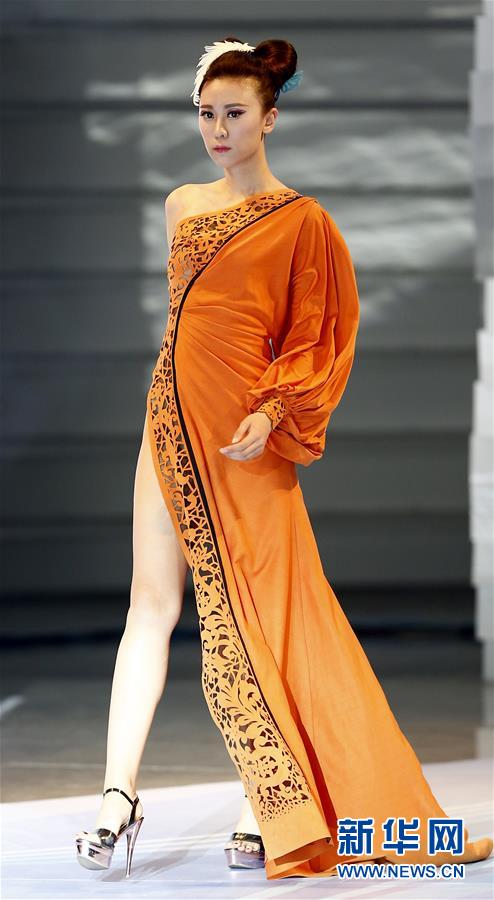 5月11日,模特在展示时装设计师刘薇设计的时装。当日,第十六届中国(青岛)国际时装周正式开幕,来自中国、韩国、日本、澳大利亚等多个国家和地区的时装设计师,将在为期5天的时装周期间进行30多个场次的时装发布。新华社记者 陈建力 摄