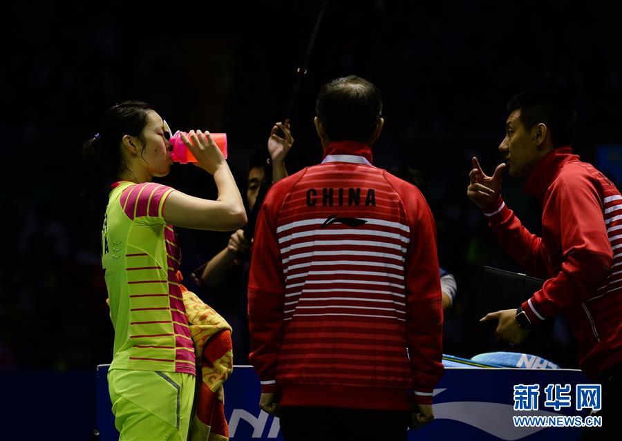 5月21日,中国队选手李雪芮(左)接受教练陈金(右)的指导。她在单打比赛中以2比1战胜韩国队选手成池铉。当日,在江苏昆山举行的2016尤伯杯决赛中,中国队对阵韩国队。 新华社记者季春鹏摄