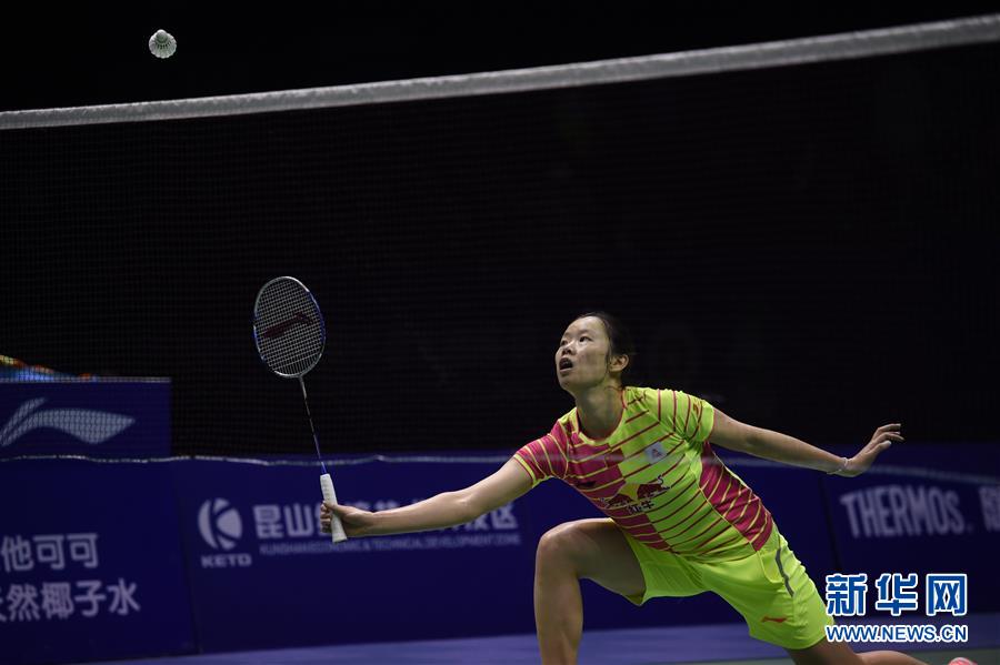 5月21日,中国队选手李雪芮在比赛中回球。她在单打比赛中以2比1战胜韩国队选手成池铉。当日,在江苏昆山举行的2016尤伯杯决赛中,中国队对阵韩国队。 新华社记者韩瑜庆摄
