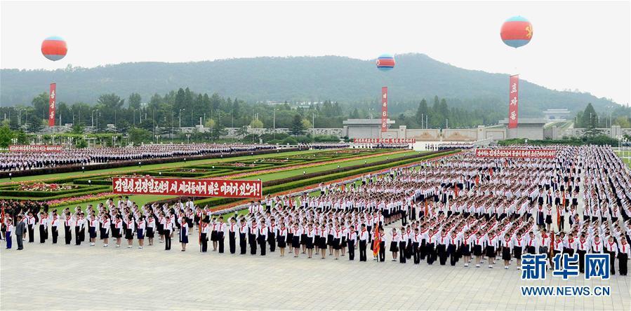 朝中社6月7日提供的照片显示,朝鲜少年团6月6日在平壤锦绣山太阳宫广场举行全国联合团体大会,庆祝朝鲜少年团成立70周年。新华社/朝中社