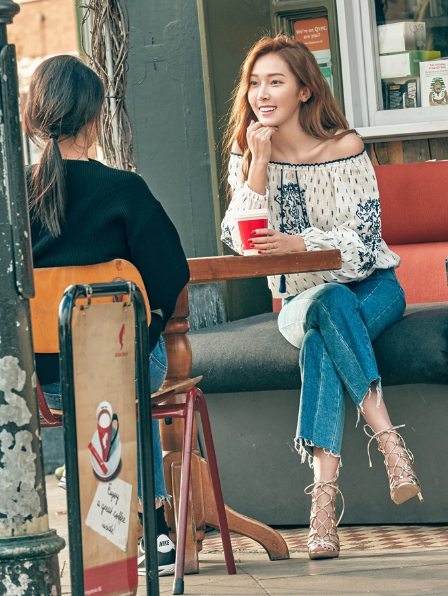 如果你以为露肩装都是一种风格,那就大错特错了。露肩装不仅能展现性感,还能演绎优雅、帅气、混搭等多样的风格。郑秀妍用波西米亚风的露肩上衣搭配牛仔裤和绑带凉鞋,性感中不失帅气。