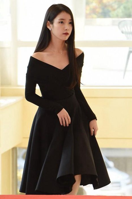 身着露肩小黑裙的IU就像《蒂凡尼早餐》中的赫本,优雅且复古感十足。这条小黑裙的露肩设计不仅突出了美丽的锁骨,还拉长了颈部线条,衬托出了IU甜美的气质。