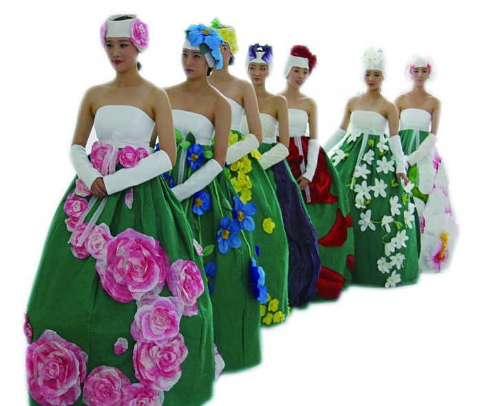 由于高丽纸透气保温的性能很好,从一开始它就是一种重要的建筑材料,应用于韩国传统房屋的窗户和地板上。韩国国内有不少以高丽纸为材料的服装设计师,他们设计的高丽纸服装走上了国际舞台。2014年仁川亚运会的开幕式上,身着象征各国鲜花的高丽纸服装的引导员带领各国运动员入场,吸引了各国媒体的眼球(如图)。韩国人的一生都和高丽纸息息相关。婴儿出生在高丽纸铺成的油纸炕上,在窗户纸和壁纸造成的房间中生活,阅读书籍、书写信件、考取功名,最后穿着高丽纸做成的寿衣入土。