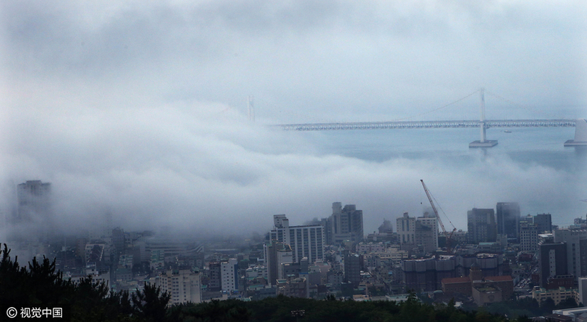韩国釜山遭梅雨锋云系侵袭 整个城市宛若“天空之城”