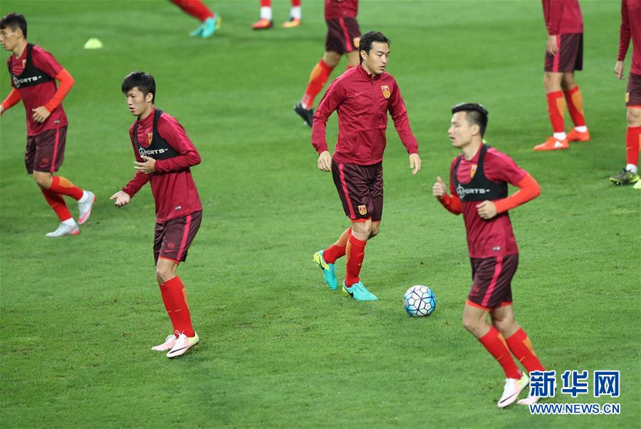 8月31日,中国队球员在训练前热身。当日,中国国家男子足球队在首尔世界杯体育场进行赛前训练,备战9月1日举行的2018年世界杯预选赛亚洲区12强赛与韩国队的比赛。新华社记者孟永民摄