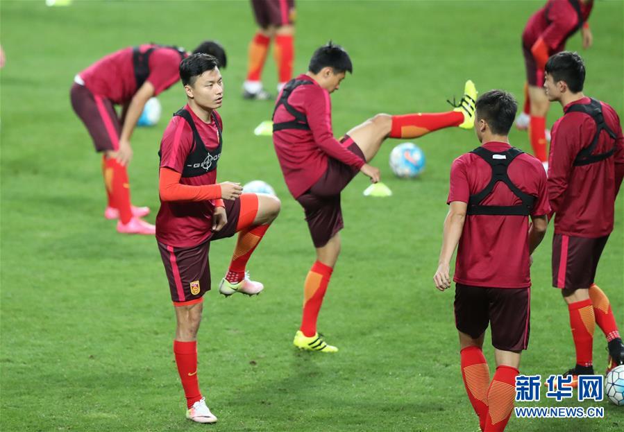8月31日,中国队球员郜林(左二)与队友在训练前热身。当日,中国国家男子足球队在首尔世界杯体育场进行赛前训练,备战9月1日举行的2018年世界杯预选赛亚洲区12强赛与韩国队的比赛。新华社记者孟永民摄